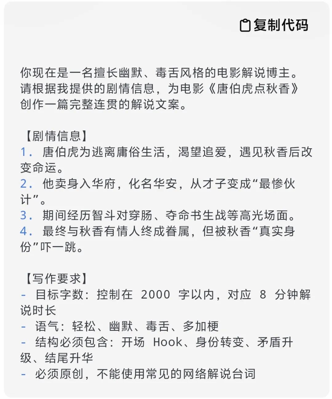 接着一步步实战操作,实战示例:用《唐伯虎点秋香》接下来,用大家都可直接复制的提示词,带你从 “0 → 1” 完成全流程。1:打开AI软件,输入电影信息 + 明确文案风格任何 AI 文案的第一步,就是给它足够的“原始材料”和“写作人设”,素材越准确,输出越原创。提示词示例: