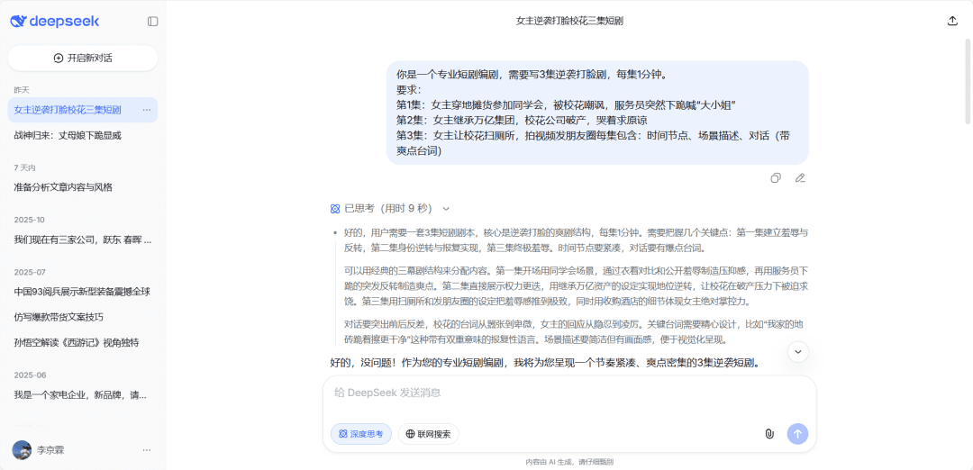 具体的运营方式还是看视频吧,介绍起来比较麻烦,细节比较多。之前做过的小伙伴可以直接去操作。那么如果有了订单,我们怎么去写剧本呢。我们用的是deepseek,给大家演示一下。百度搜索deepseek,然后根据用户的需求给他一个指令:你是一个专业短剧编剧,需要写3集逆袭打脸剧,每集1分钟。