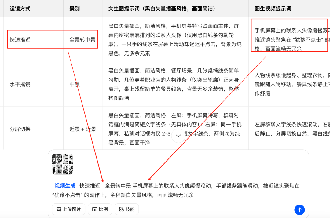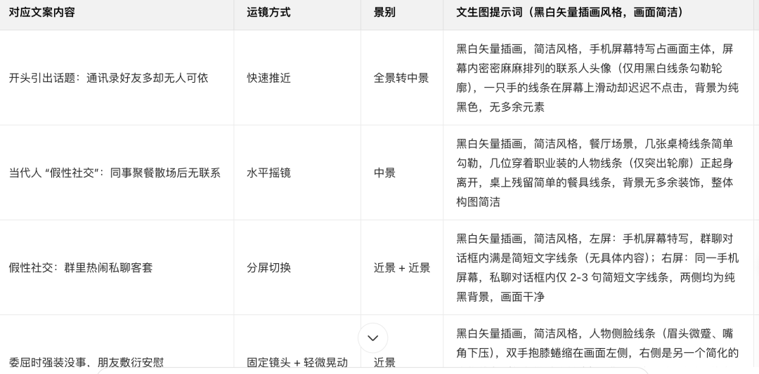 | 请根据前面的文案,帮我写出20组分镜头脚本,包括运镜,景别,文生图提示词,图生视频提示词,图片内容要简洁,统一采用黑白矢量插画风格,以表格形式先提供前8组分镜头脚本。 |