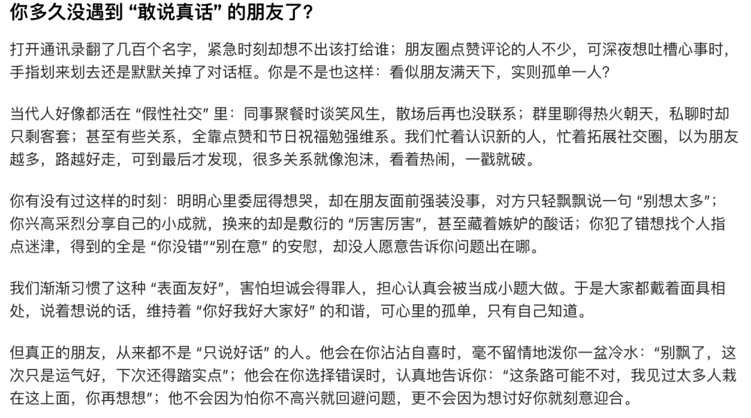 | 请参考前面提取出的文案,帮我重新写一份关于“真正的朋友”的文案,要求要能与用户产生共鸣,兼具专业性和正向引导,中间要加入当代人普遍存在的现象来引申讲述主体,用共情代替说教,用温暖治愈替代理论科普。遵循短视频的黄金三秒的原则,开头先引出话题!字数控制在1000字左右! |
