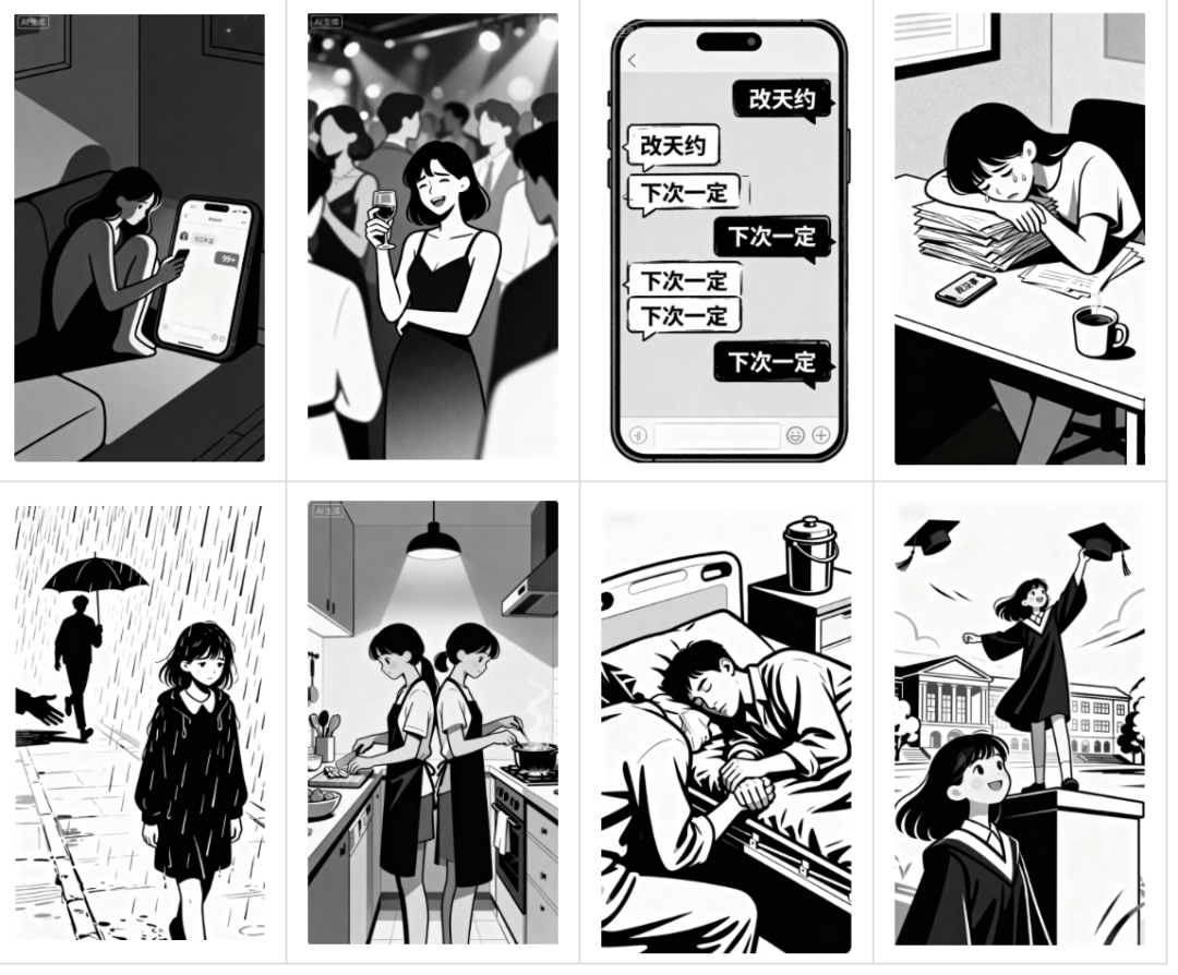 | 请根据表格内的文生图提示词,给我生成这8组图片,要求图片风格前后保持一致,图片比例为9:16 |
