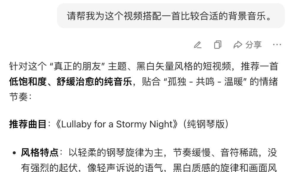 我们还可以继续问豆包,让豆包为我们这个视频搭配一首比较合适的音乐做为背景音乐!