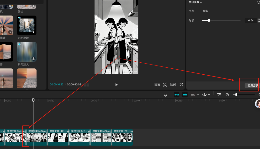 第五步:剪映剪辑成片 将前面所有的视频都生成完毕之后,都导入到剪映内,然后按照顺序拖入主轨道上,添加合适的转场,然后点击右上角的“应用全部”按钮,这样就不用我们一个一个的添加了。