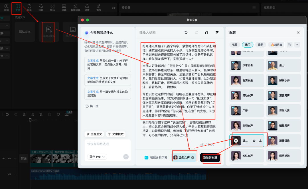然后就是将前面的文案,使用剪映的口播功能,生成字幕和音频,操作如下图所示: