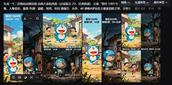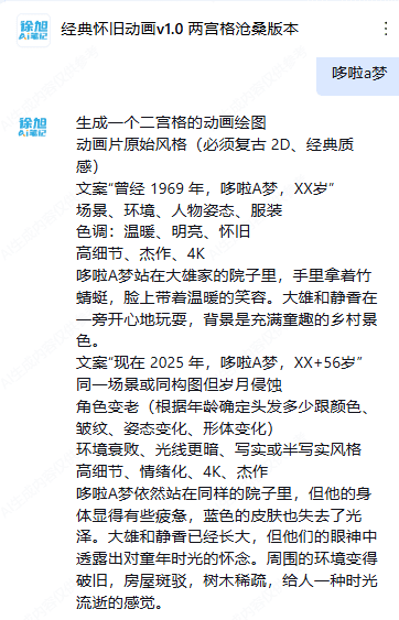 文案“曾经 1969 年,哆啦A梦,XX岁”场景、环境、人物姿态、服装色调:温暖、明亮、怀旧高细节、杰作、4K哆啦A梦站在大雄家的院子里,手里拿着竹蜻蜓,脸上带着温暖的笑容。大雄和静香在一旁开心地玩耍,背景是充满童趣的乡村景色。
