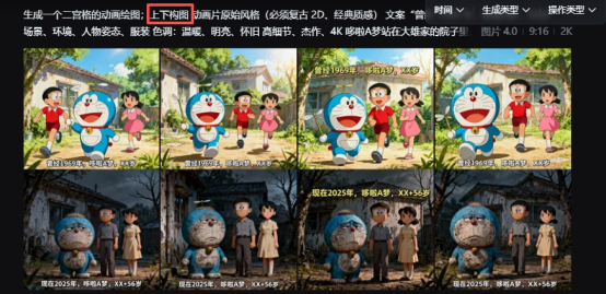 注意:如果出现构图为左右的,可以在提示词二宫格画面图后面加上:上下分布或者上下构图这类词语