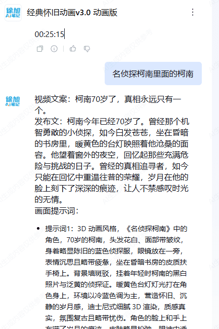 提示词1:3D 动画风格,《名侦探柯南》中的角色,70岁的柯南,头发花白、面部带皱纹,身着略显陈旧的蓝色侦探服,眼镜放在一旁,表情沉思且略带疲惫,坐在昏暗书房的皮质扶手椅上。背景墙斑驳,挂着年轻时柯南的黑白照片与泛黄的侦探证。暖黄色台灯灯光打在角色身上,环境以冷蓝色调为主,营造怀旧、沉静的岁月感,迪士尼式细腻 3D 渲染,质感真实,氛围复古且略带忧伤。角色的脸上和手上布满了岁月的痕迹,皮肤略显松弛,眼神中透露出一丝无奈。