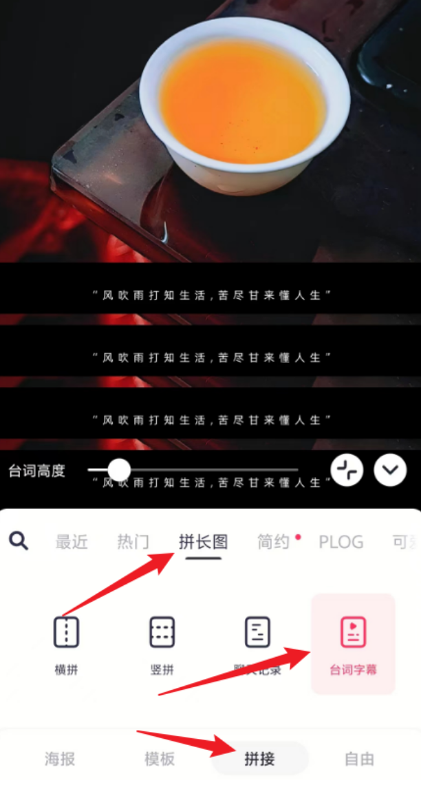 通过软件内嵌拼图功能批量导入素材,启动台词字幕模式进行自动组合。