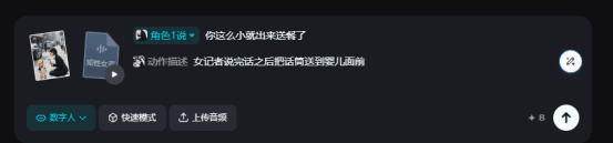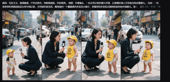 画风:写实主义,高清晰度,户外自然光,电影级画质,色彩明亮。构图:中景镜头,一位女性记者和婴儿并排,记者手持麦克风对着婴儿。内容:一位身穿深色西装的短发女性中国记者,手持银色麦克风,侧身面向一个戴着黄色外卖员小帽子、穿着印有外卖标志围兜和尿布的中国婴儿。婴儿正脸,正对着前面眼睛看着镜头,婴儿站在地上。婴儿的表情严肃而略带愁容,似乎在认真回答问题。场景:一个热闹的街口,有川流不息的车辆、来来往往的行人、街边的店铺招牌(模糊)。地面:灰色的水泥路面。