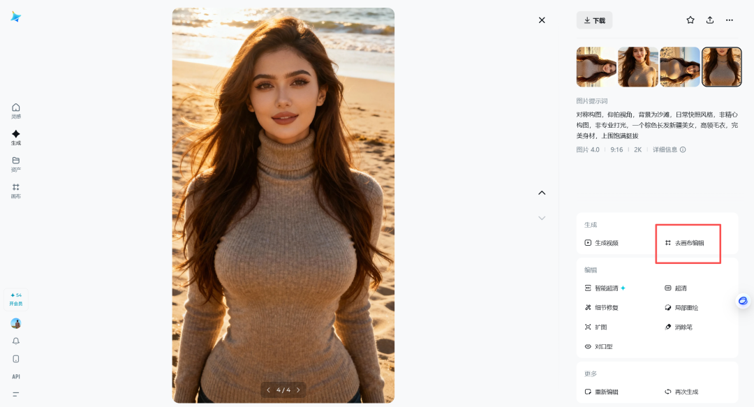 1.打开即梦平台网址:https://jimeng.jianying.com/模型选择即梦4.0输入一个超级超级能展现魅力的提示词:对称构图,仰拍视角,背景为沙滩,日常快照风格,非精心构图,非专业打光,一个棕色长发新疆美女,高领毛衣,完美身材,上围饱满挺拔