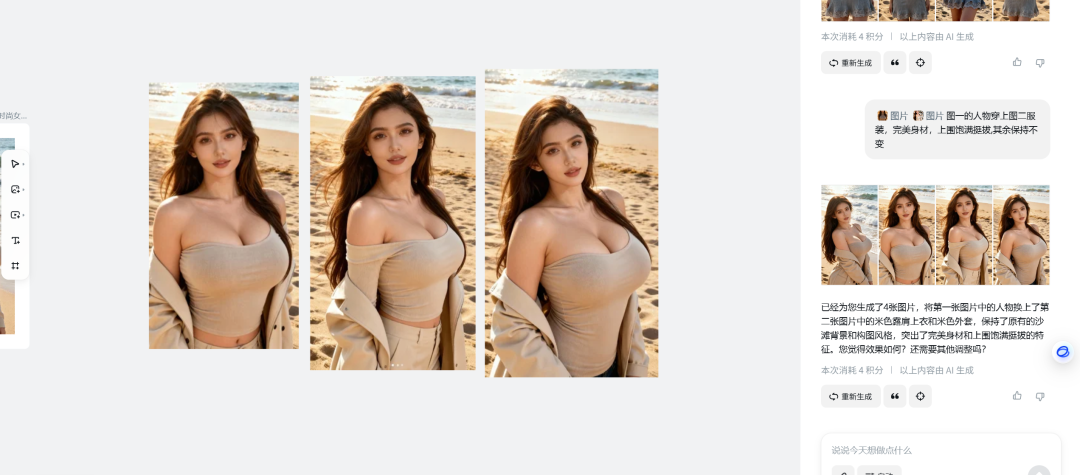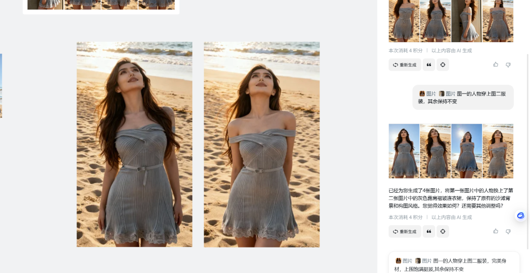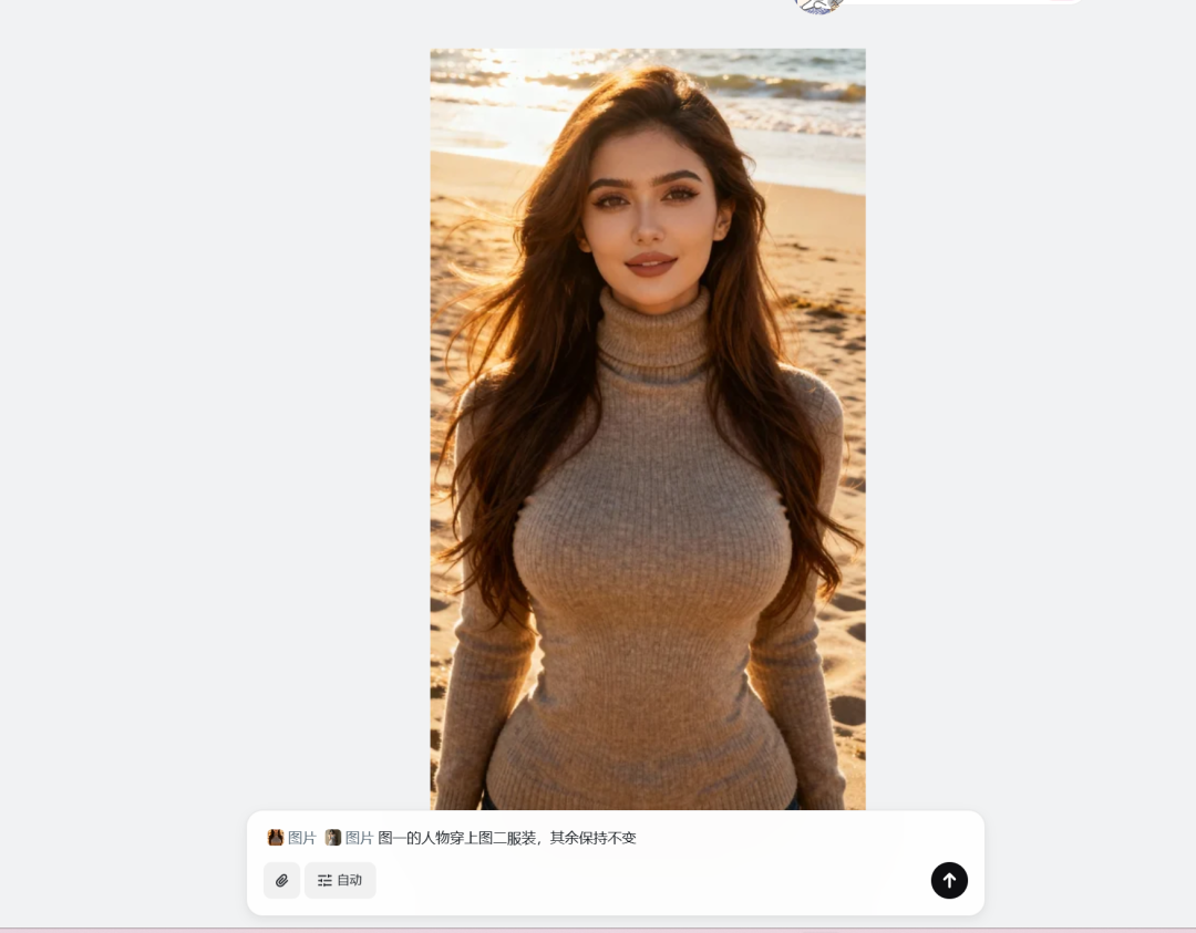 回到即梦的对话框,粘贴图片,在输入这句超级超级不是很哇塞的提示词:图一的人物穿上图二服装,其余保持不变