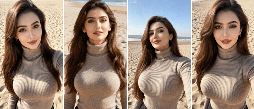 | 对称构图,仰拍视角,背景为沙滩,日常快照风格,非精心构图,非专业打光,一个棕色长发新疆美女,高领毛衣,完美身材,上围饱满挺拔 |