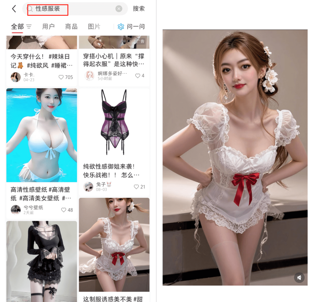图片确实很哇塞,大家可以从里面选择一张自己的图片,点击图片,放大到右侧显示区。 由于现在的AI工具,不给我们生成一些尺度稍大的图片,不过我们可以换个方式曲线救国。 打开小红书,搜索一些大胆的图片!