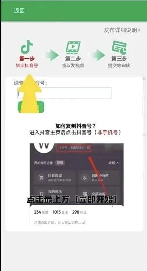 打开软件后点击最上方立即开始,第一步绑定抖音号