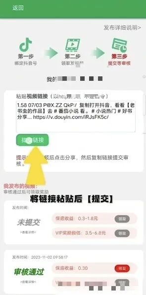第三步提交链接审核,在抖音我里面找到刚才发布的视频,点击右下角三个点,点击复制链接,回到我们软件,将链接粘贴后提交,这样一个任务就完成了。