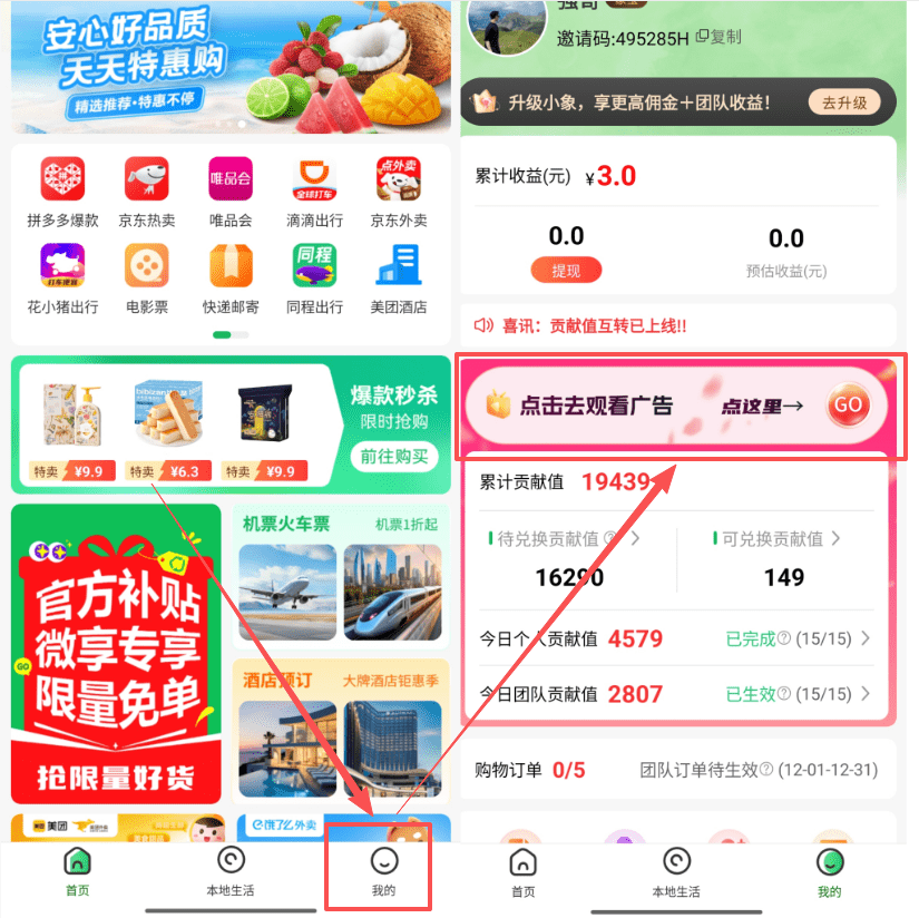 今天我们主要说的是看广告撸收益,所以买东西的是大家可以不用考虑,下面我来说一说怎么操作。项目操作我用自己的小号号给大家演示下,打开软件后点击我的,然后点击中间的观看广告就可以进入看广告页面: