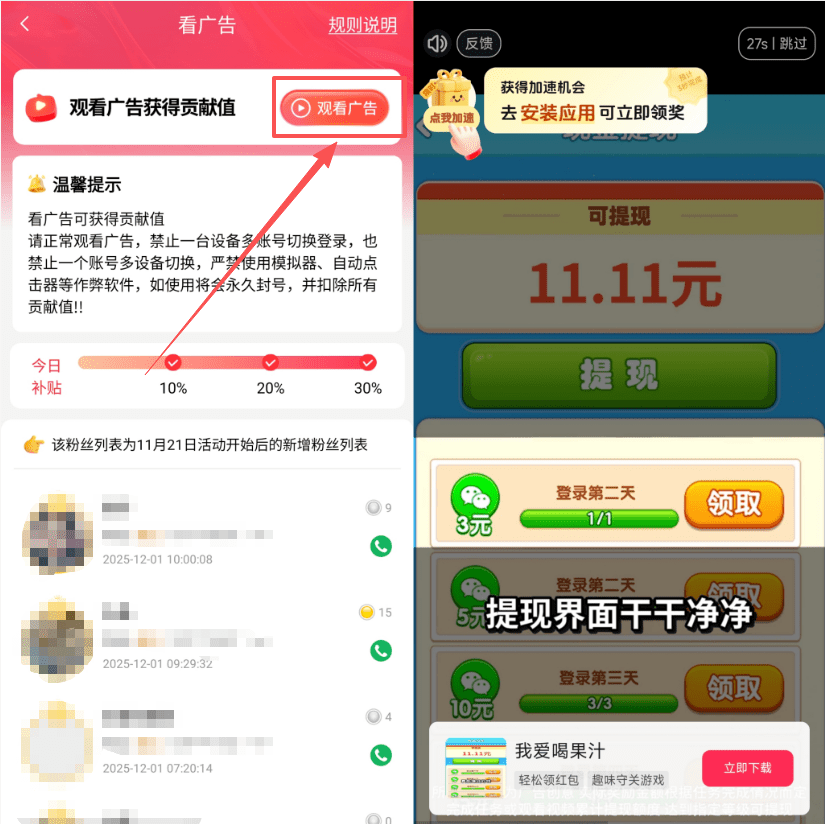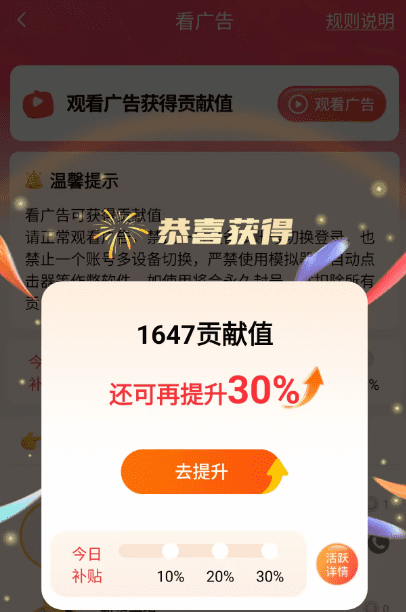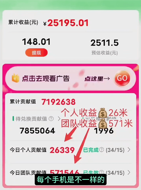 3、经团队测试,广告商在用户玩手机较多时段加大预算投放,这些时段更容易看到高价值广告,具体时段为早上 7 点 – 8 点、中午 11 点 – 1 点、下午 4 点 – 5 点、傍晚 7 点 – 8 点、晚上 9 点 – 11 点以及凌晨 0 点 – 1 点。注意事项1、每天需要看满 15 条广告,第二天结算。如果没有看满 15 条,收益累积到待兑换贡献值,40 天后结算。