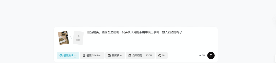 2.打开即梦平台网址:https://jimeng.jianying.com/ai-tool/generate/?type=video上传图片,选择视频3.0 fast,填充提示词:固定镜头,画面左边出现一只手从卡片的茶山中夹出茶叶,放入右边的杯子
