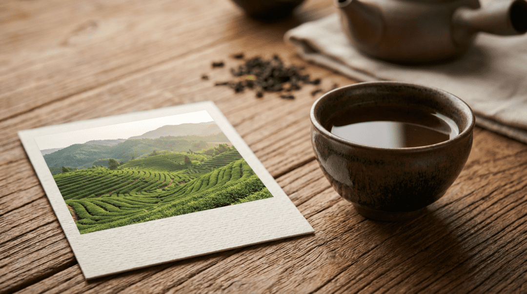 模版如下:一张木质桌子上,左边放的一张卡片,卡片是真实的(安溪茶叶茶山),右边是放的一个(茶杯),真实摄影风格模型选择nano banana pro