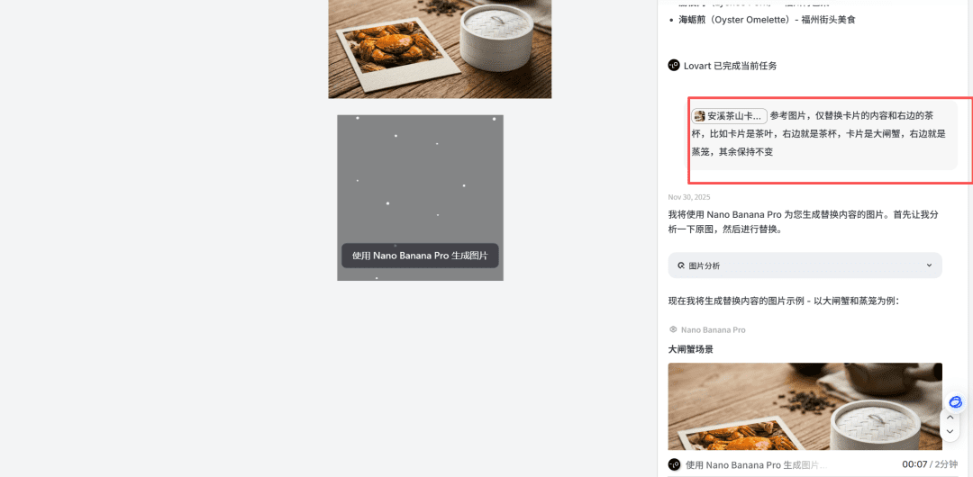 ps:有人会有疑问为什么不直接在即梦生图,nano2生成效果比较好,大家也可以直接使用即梦进行生图如果想保证所有图片的位置都一样,可以借助参考图模式,上传第一张图片,输入提示词:参考图片,仅替换卡片的内容和右边的茶杯,比如卡片是茶叶,右边就是茶杯,卡片是大闸蟹,右边就是蒸笼,其余保持不变