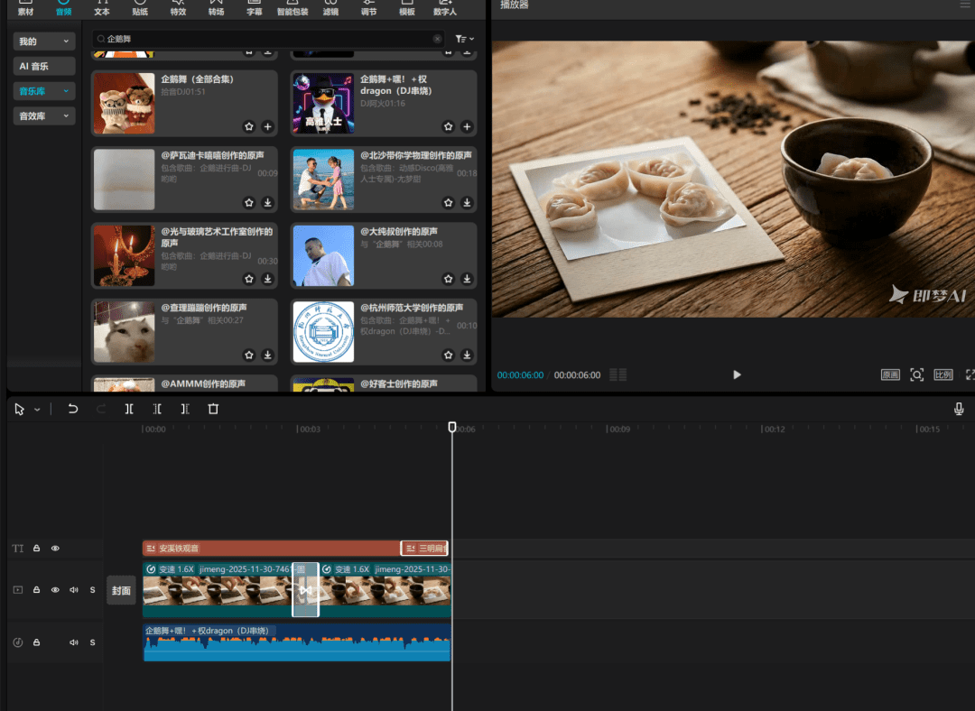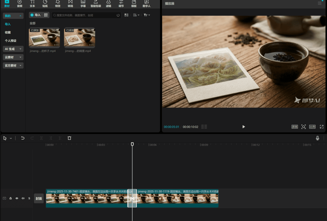 3.打开剪映把生成视频片段导入剪映,这里时间有限生成俩个,大家自由发挥,添加合适的转场