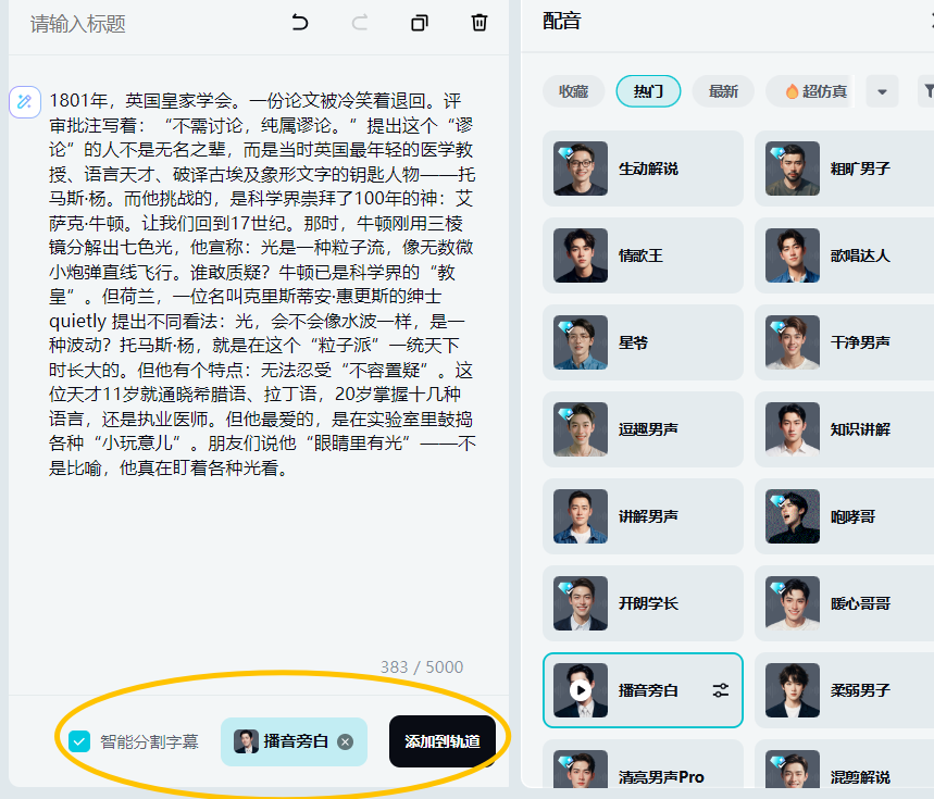 把deepseek生成的文案复制进去,然后选一个自己喜欢的音色配音,打开【智能分割】–添加到主轨道,