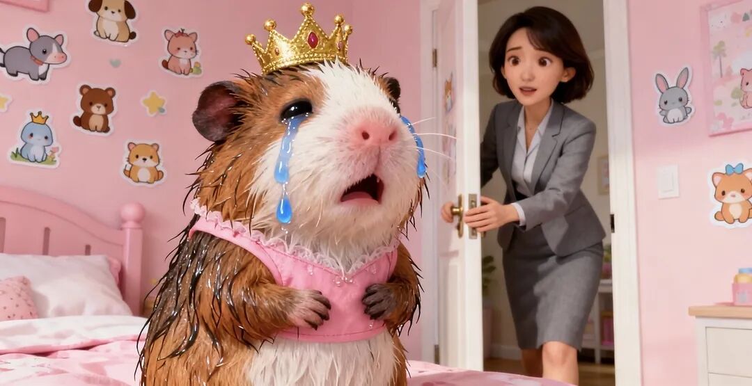 画面提示词:毛发湿透的豚鼠“猪妞”戴金色小皇冠、穿粉色服