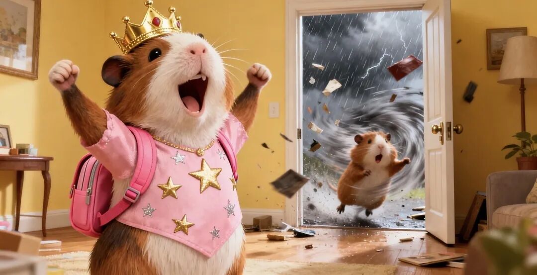画面提示词:穿带星星粉色服饰、戴金色皇冠的豚鼠“猪妞”,背粉色小书包,在暖黄色房间里振臂高呼,随后开门被台风吹走,门外风雨杂物横飞,明亮卡通风格,暖色调,先特写后全景,体现倔强与突发状况的喜剧反差