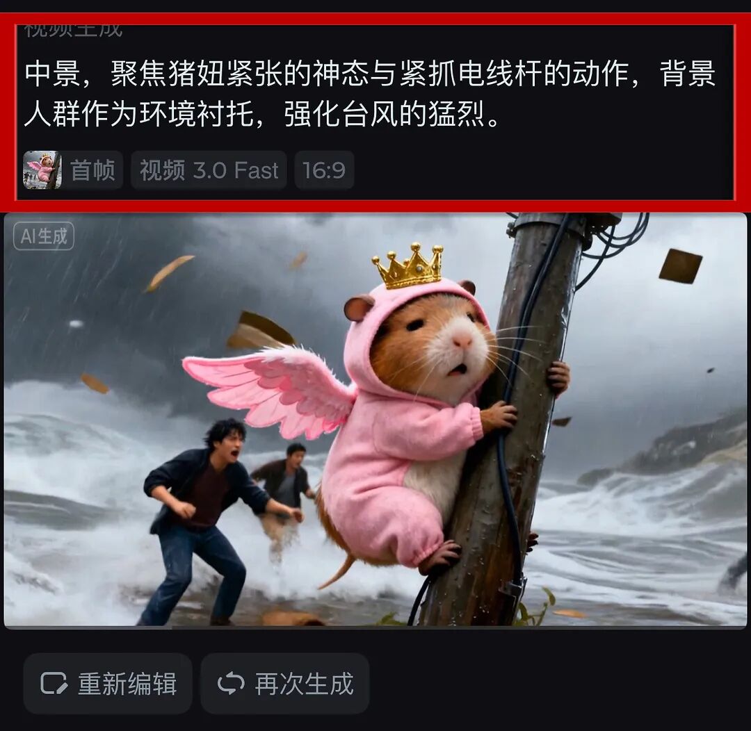 画面提示词:一只穿粉色带粉翼连体衣、戴金色小皇冠的拟人豚鼠,在狂风暴雨中紧抓电线杆,雨水狂落、杂物飞舞,背景人群在台风中惊慌奔跑,写实卡通风格,动态模糊,中景镜头,营造台风天的紧张惊魂感