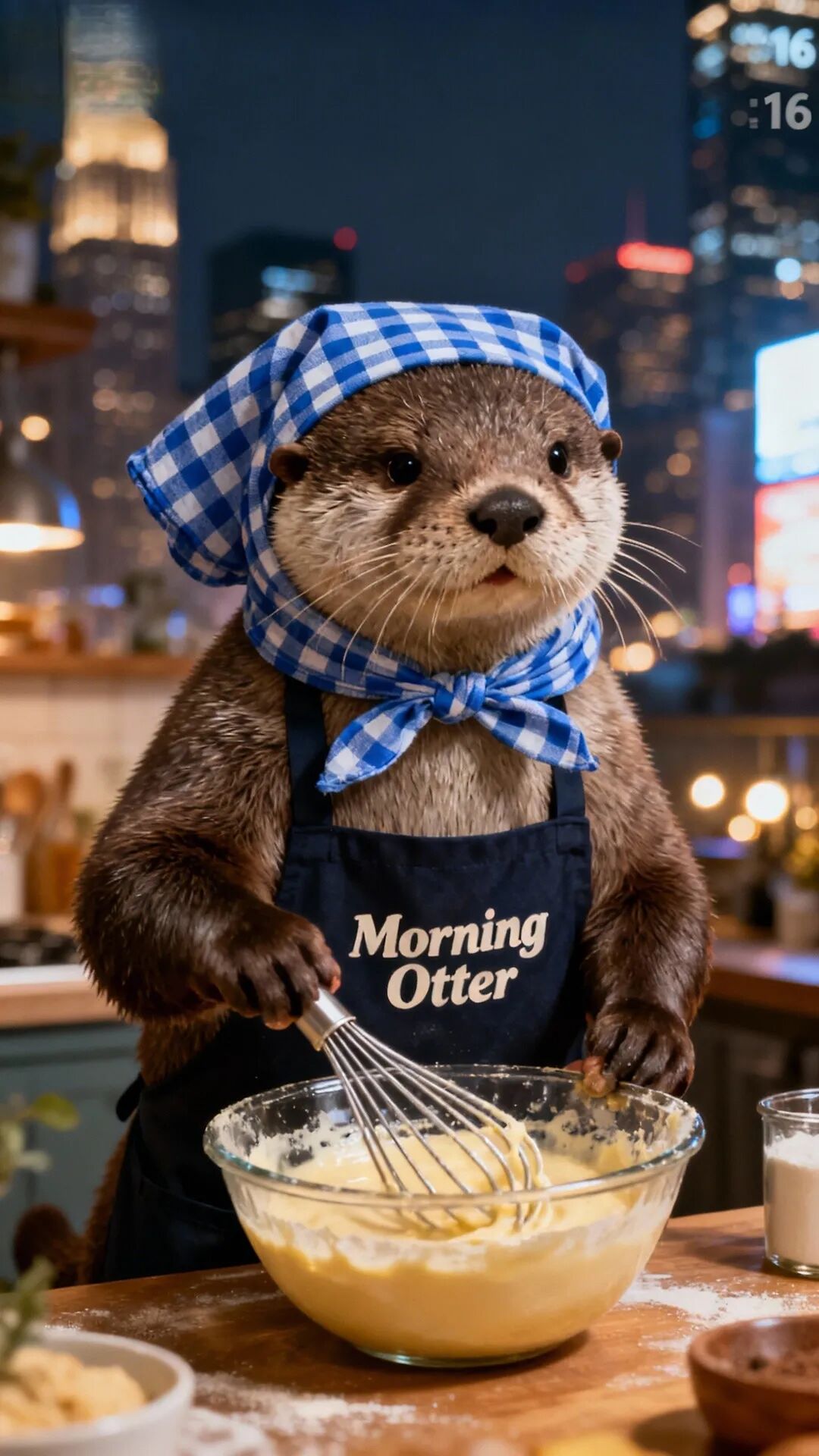 一只可爱的水獭,戴着蓝色方格大手帕,系着深色围裙,上面有“Morning Otter”的文字,用打蛋器在碗里搅拌面糊,超写实,细致的皮毛,温暖的灯光,繁华的城市背景,美食摄影风格,9:16