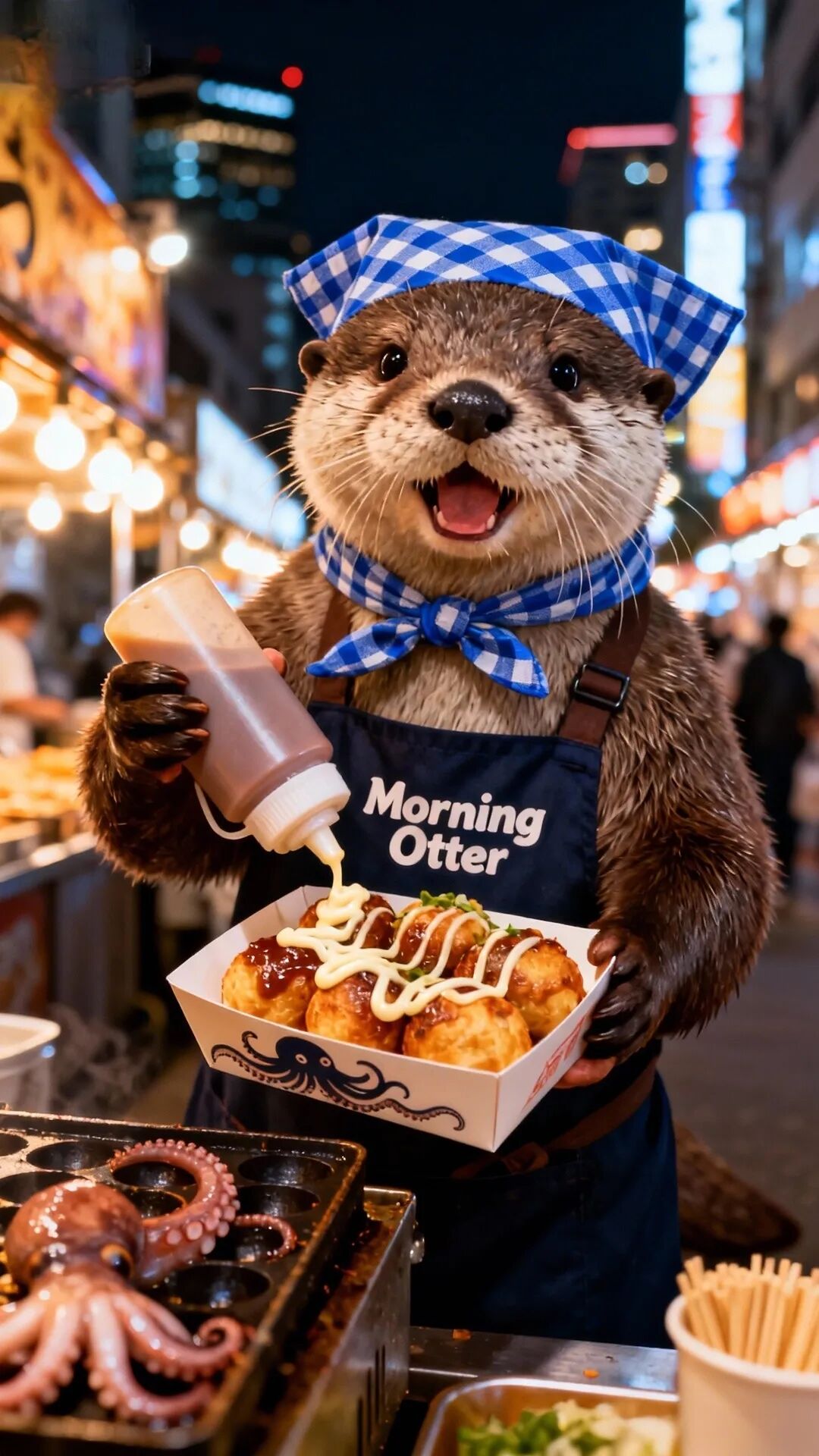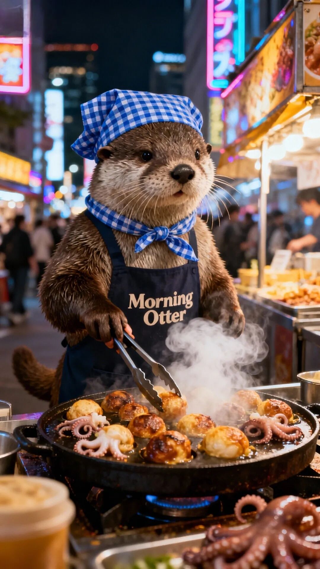 一只可爱的水獭,戴着蓝色方格大手帕,系着深色围裙,上面有“Morning Otter”的文字,水獭在章鱼烧锅上用钳子做章鱼烧,夜市的氛围,锅里冒出的蒸汽,详细的烹饪过程,超写实,细致的皮毛,温暖的灯光,繁华的城市背景,美食摄影风格,9:16