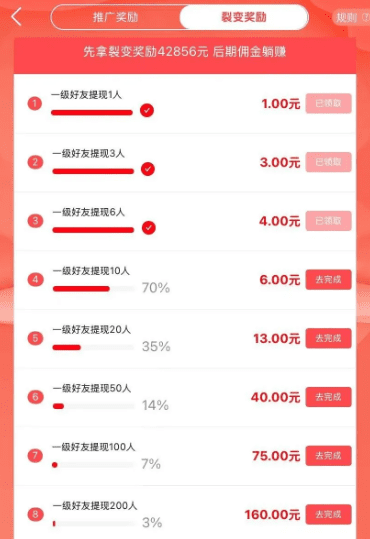 3,阶梯裂变提现奖励,这个奖励可以说是双向的,只要你的推广的用户,在平台做任务提现(满一元就可以提现),你就可以获得相应奖励。