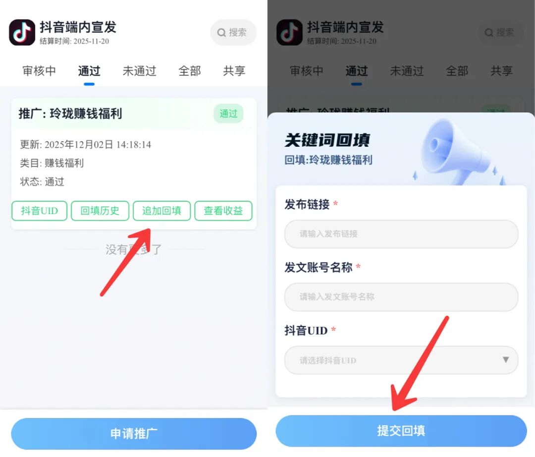 特别注意,视频发布后要第一时间回填作品链接,在推广平台填写作品链接、账号名称和抖音 UID 并提交,否则无法统计订单,也就无法获得佣金。