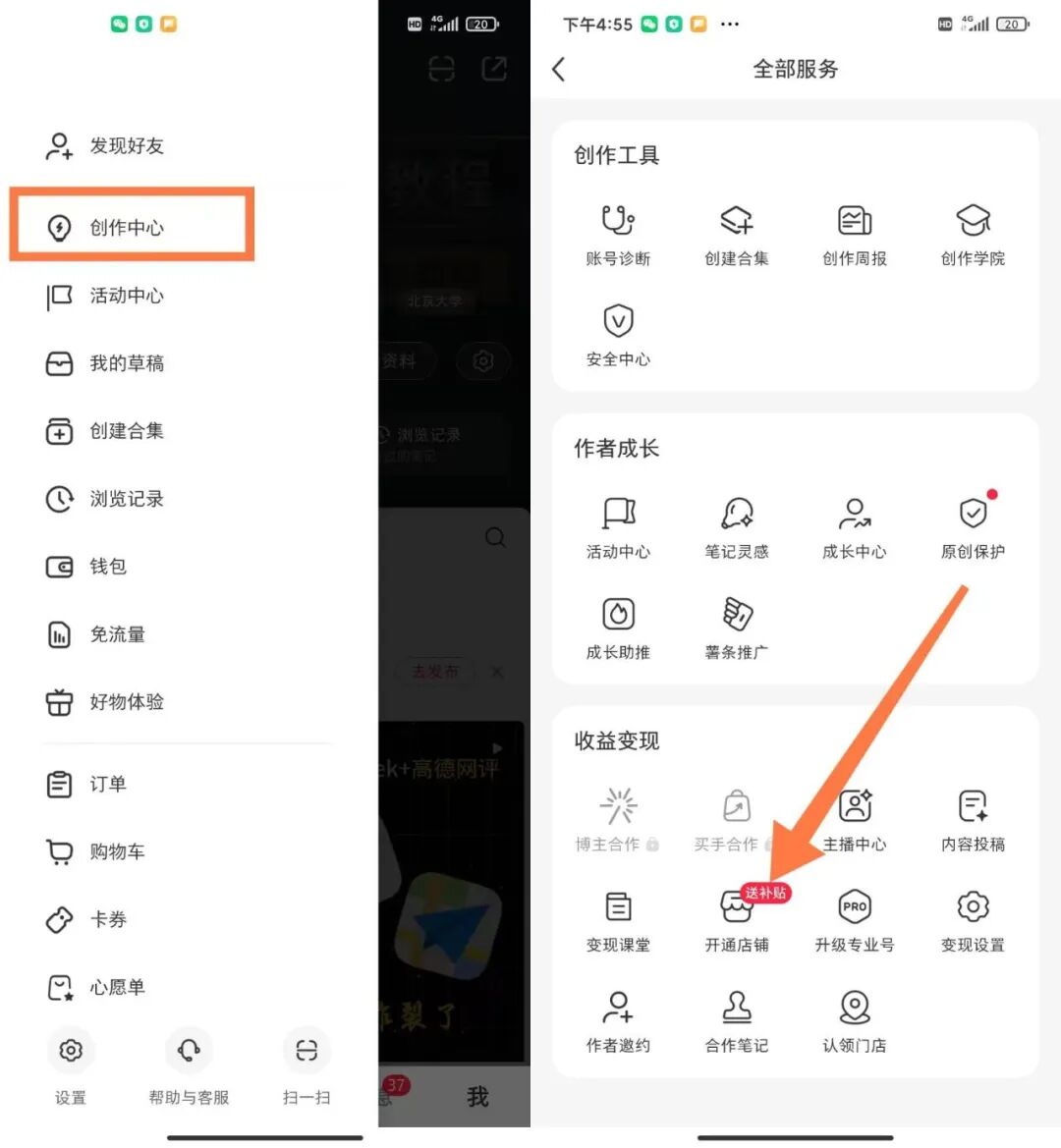 左上角三条横线—创作者中心—全部服务—开通店铺