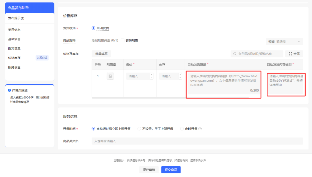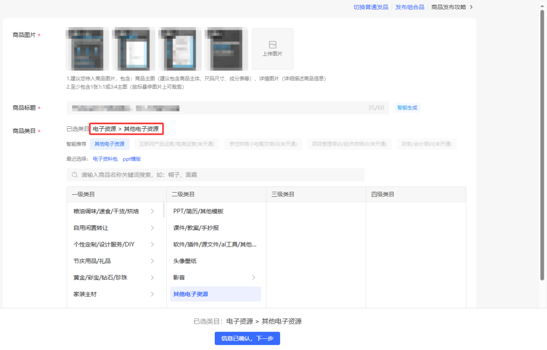 注意类目,要选择二级类目“其他电子资源”,因为只有这个类目,才可以用小红书官方的自动发货功能。