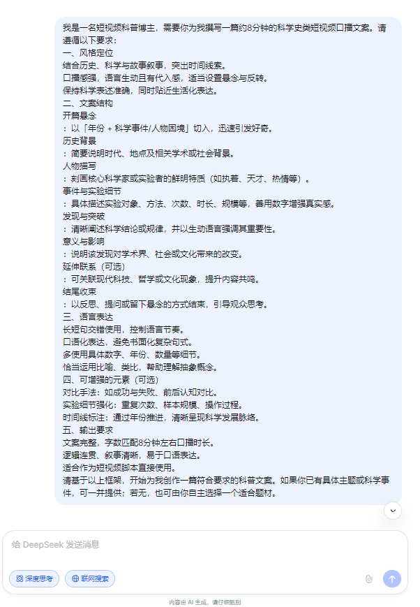第一步,用DeepSeek生成文案脚本