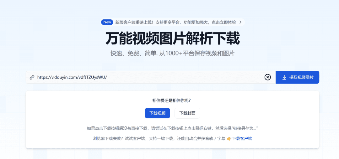 目前支持复刻抖音、头条、西瓜和本地上传,我需要复刻的视频如下:如果大家想要复刻别的平台视频,只能下载到本地,可以借助这个万能下载工具进行下载网址:https://snapany.com/zh