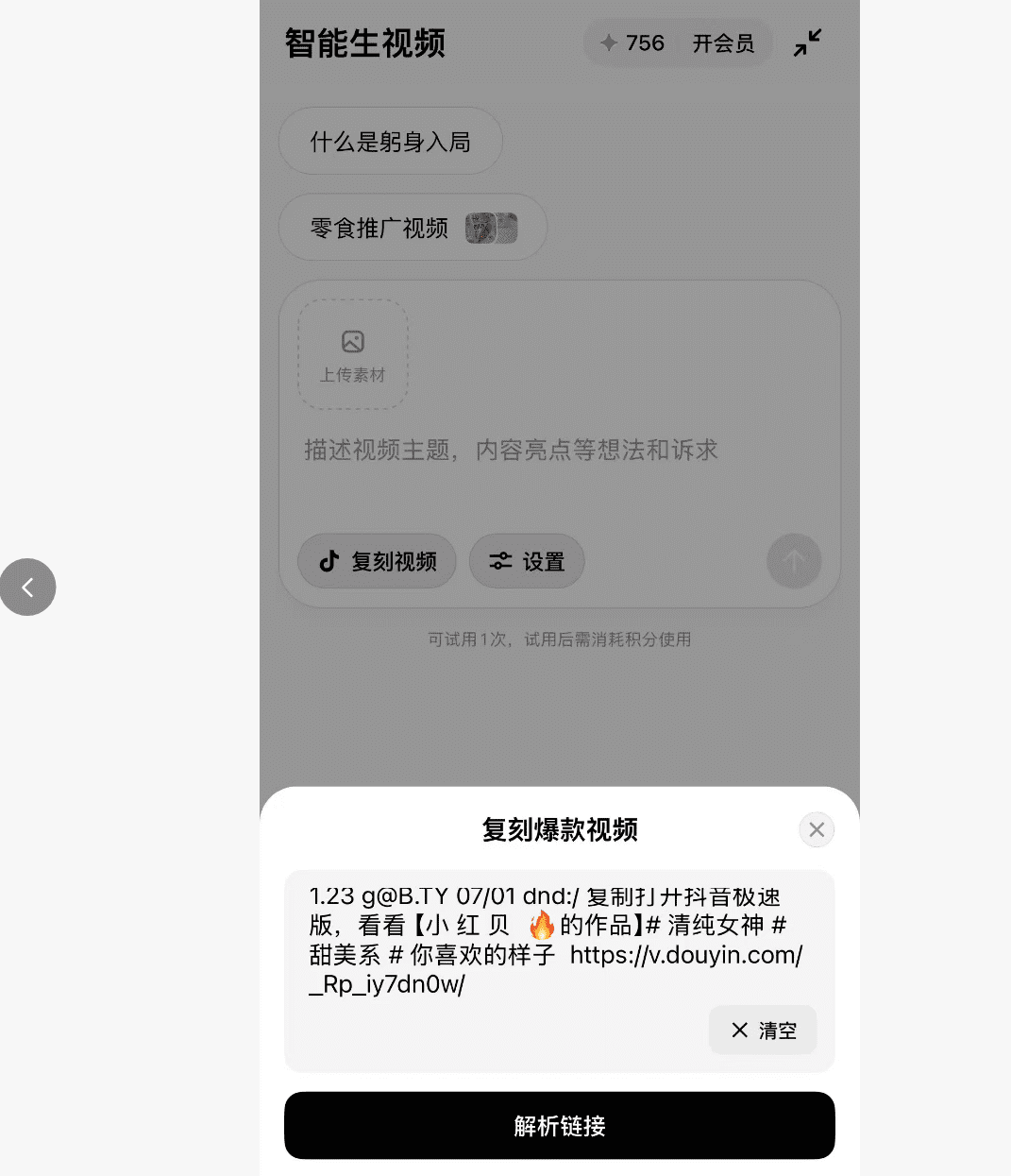 虽然我相信这条路早晚会走通,没想到出现这么快,最近剪映旗下的小云雀出手了,上新了一个爆款复刻功能,你无需写任何提示词,你只需要给我一个视频链接,其余的你都不用管。