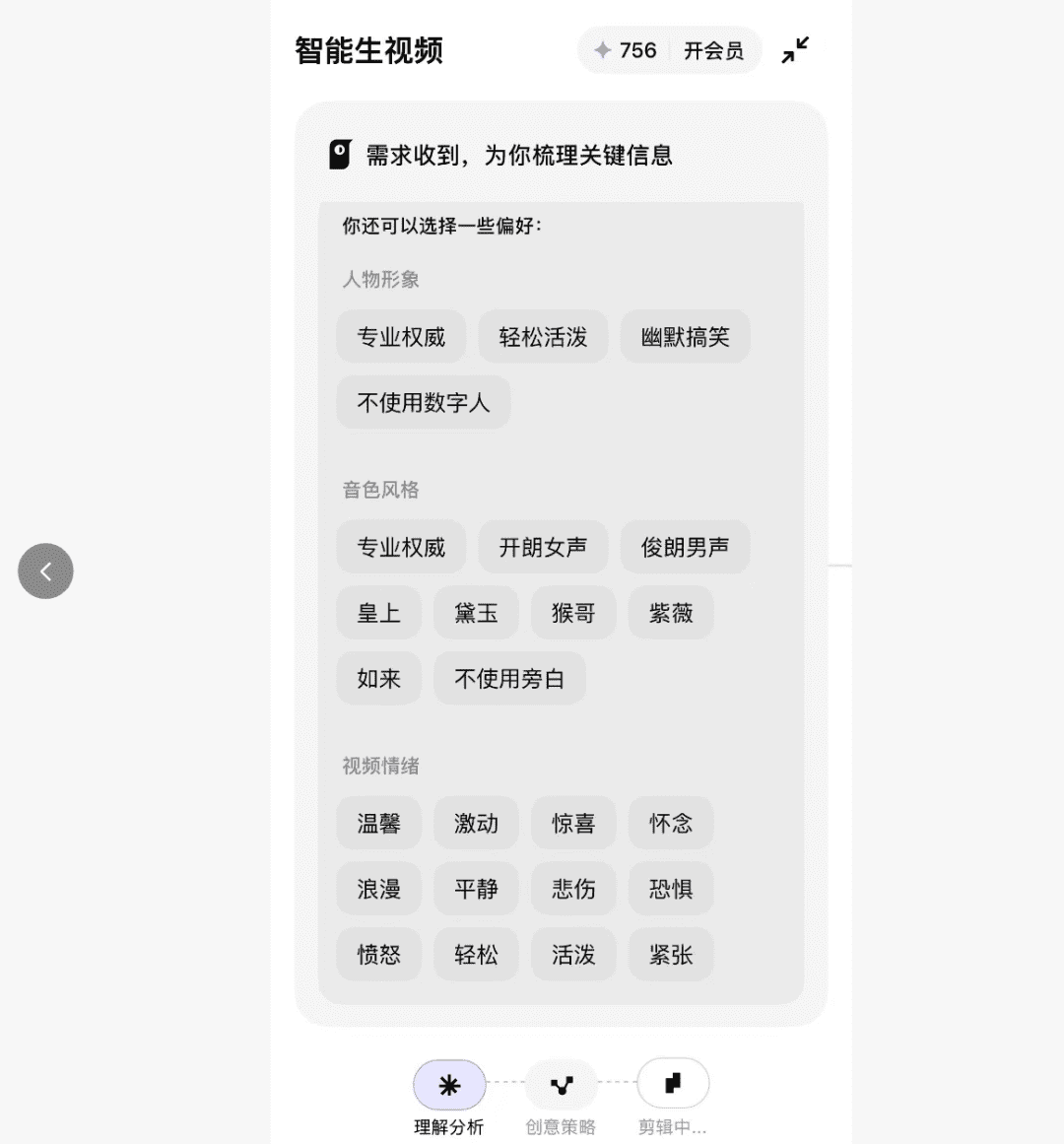 6.需求确认当接收到需求之后,为了保证视频生成能符合你的预期,有一个让你进行补充信息环节,你可以选择不填
