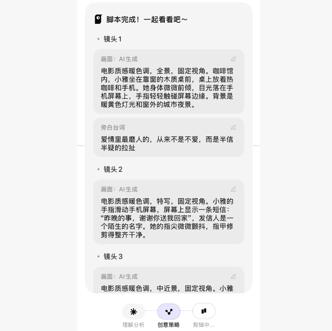 7.分镜脚本与视频创作接下来就会自动设计视频脚本,生成分镜脚本,有画面提示词,还有旁白,接的就会自动进行生图、生视频