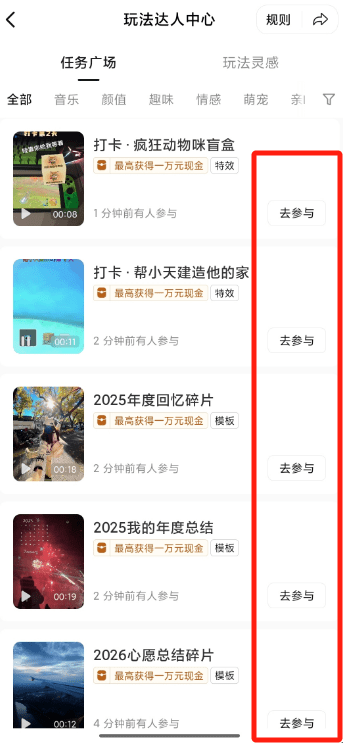 在玩达人首页可以看到任务广场,里面都是当前正在进行的任务,同时你也可以参加