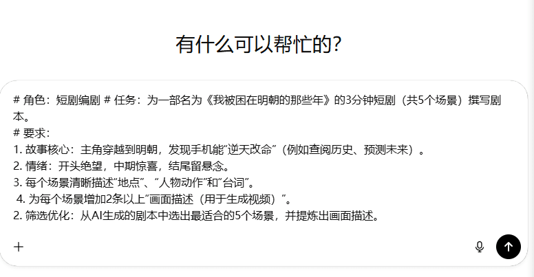 【操作流程】1. 输入你准备好的初始指令,设定出故事背景和风格,如果你没有思路,可以借鉴我下面的提示词,然后稍微修改一下 也行。提示词(Prompt):# 角色:短剧编剧 # 任务:为一部名为《我被困在明朝的那些年》的3分钟短剧(共5个场景)撰写剧本。