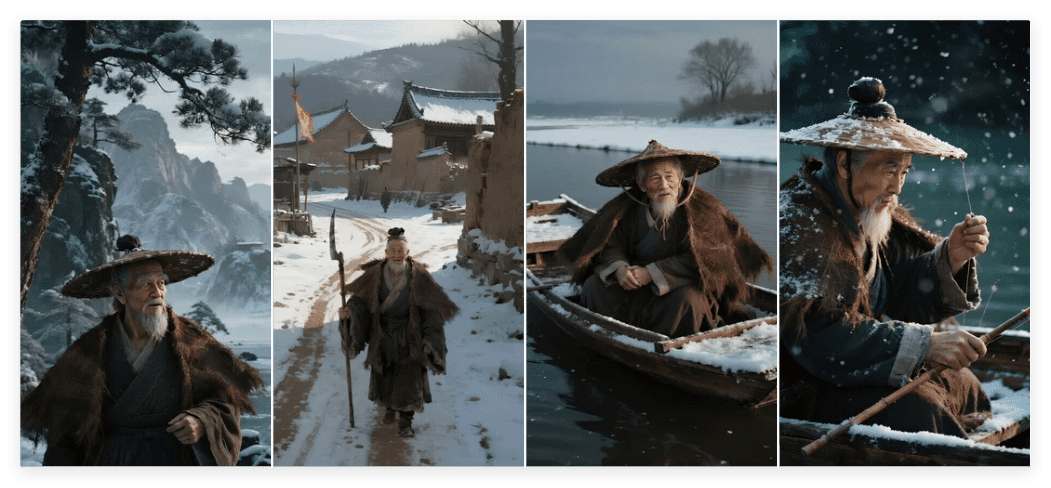 2.整个流程不难,可以先从简短的古诗去入手练习全流程制作,分镜比较少剪辑也简单,所以先从古诗开始,古文都比较长,有些人物角色比较多的,可以使用即梦先生成人物角色图,再用即梦4.1 的参考人物和分镜画面去生成分镜图,就可以保证人物一致性的。