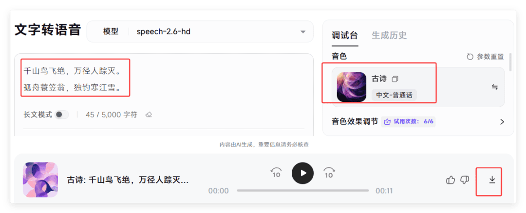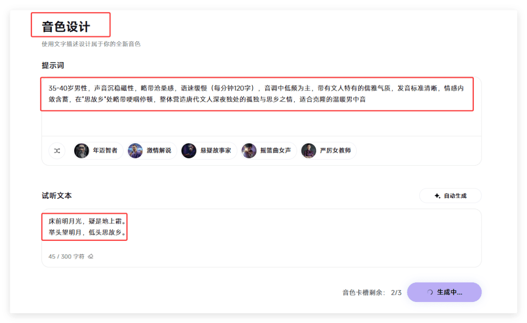 1.我想要独特的朗诵古诗的声音,minimax国内的比较方便2.网页地址:https://www.minimaxi.com/audio/(手机或者微信登录都可以)3.登录后,左侧找到音色设计(输入豆包给的旁白音色描述)