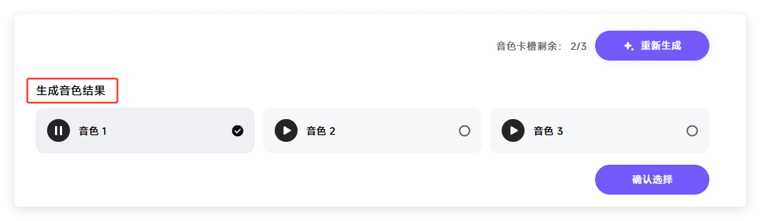 4.系统会生成三个音色,自己选择一个适合的音色确认生成,保存命名音色声音
