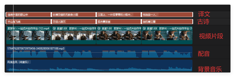 1.把即梦生成的视频片段,和minimax的音频导入剪映2.根据旁白音频调整画面时长,对齐音频