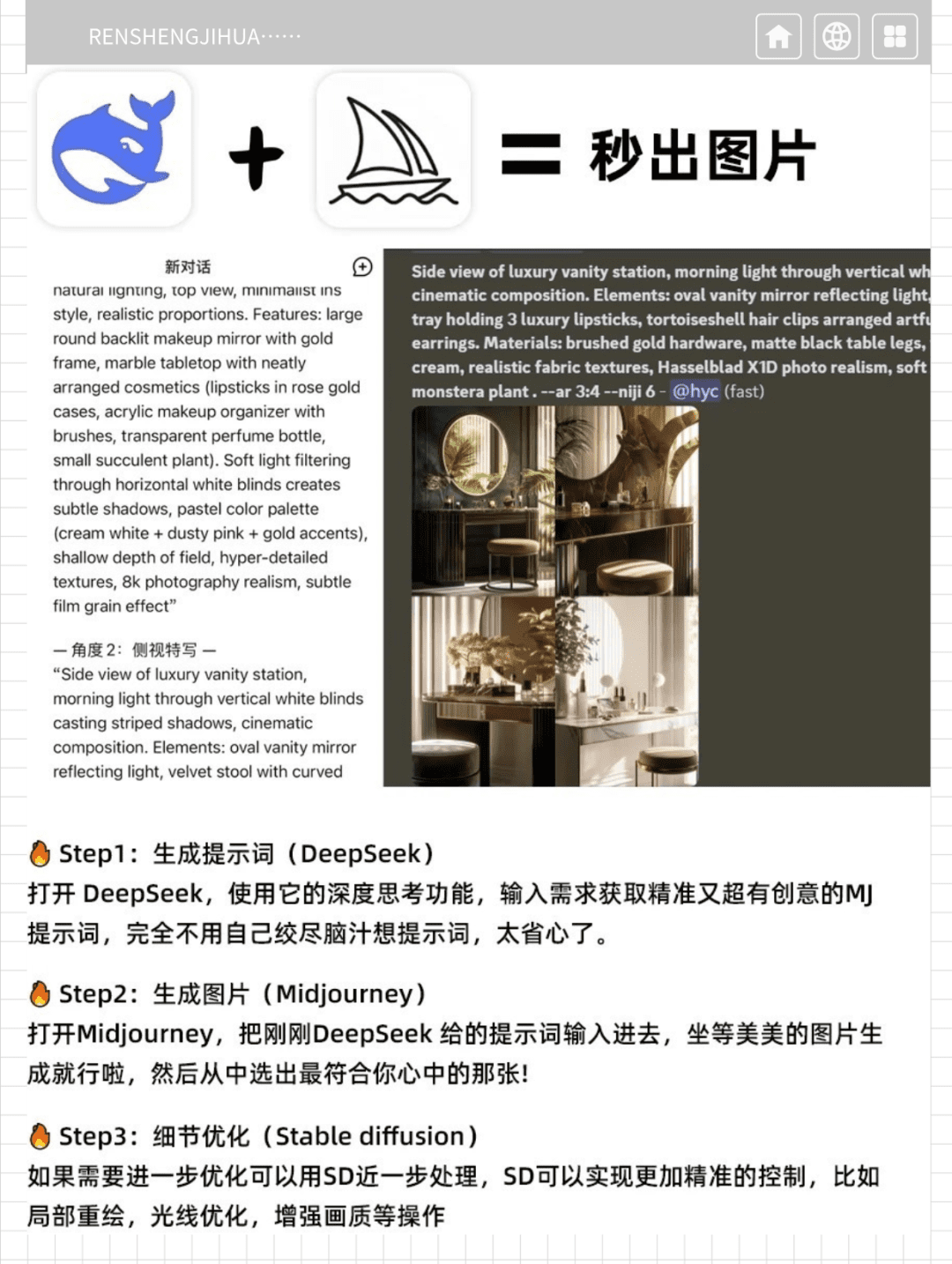 下面就给大家实操演示一下。01.生成图片提示词在deepseek中输入提示词,让它们帮你撰写图片提示词: