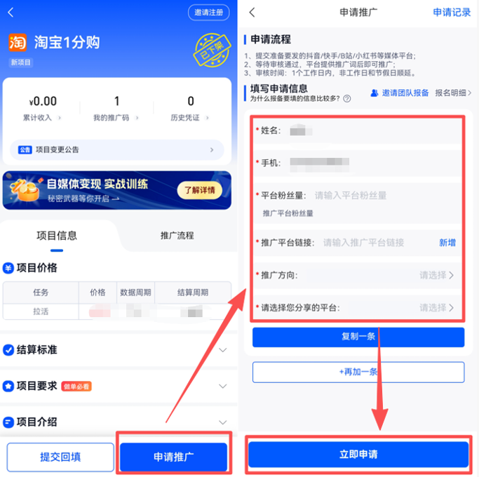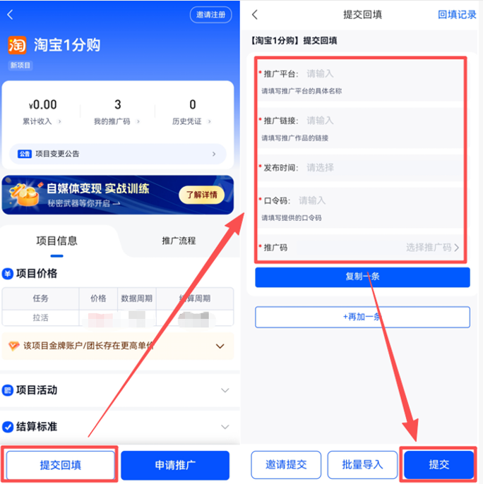 推广作品发布后,及时返回任推邦平台,找到 “淘宝 1 分购” 项目,点击 “提交回填”,填写推广平台名称、推广作品链接、发布时间、口令码等信息,完成提交即可。项目结算周期为每周三,统一结算上一整周的有效数据,周末及法定节假日顺延,收益到账稳定靠谱。