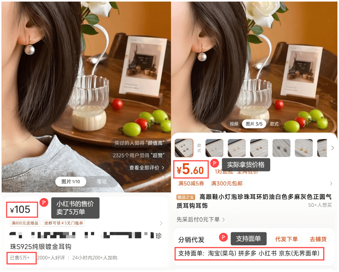 像这个耳饰在小红书上卖105元,卖了5万单,但实际的拿货价格只要5.6元,中间有100元的差价。