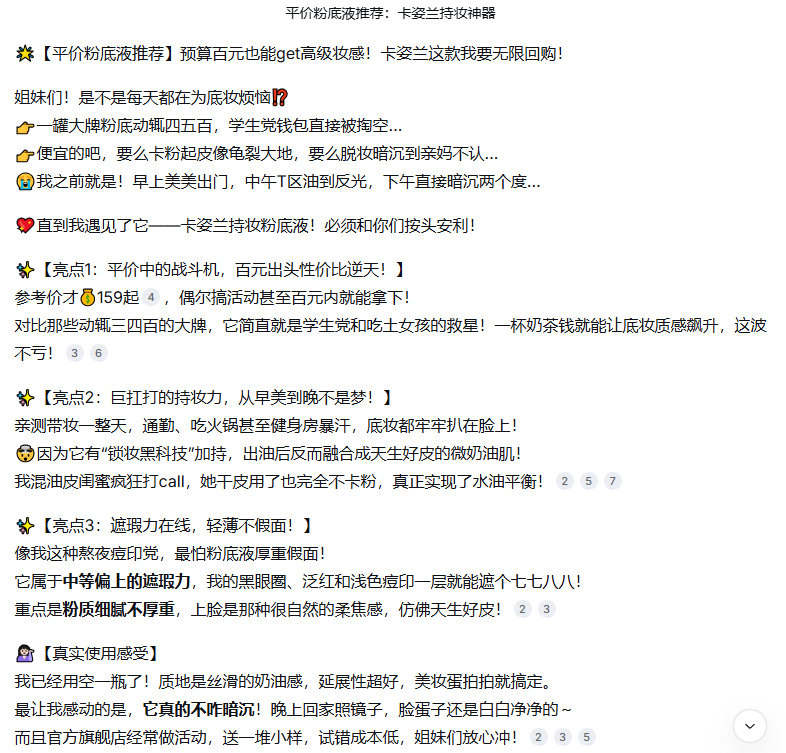 你是一个有亲和力的小红书带货博主,要带货这款“卡姿兰”粉底液。请根据主题【平价粉底液推荐】写一条种草笔记,要求:1.引出使用痛点 2.介绍产品亮点(控制在2-3点)3.用真实体验语气总结。适合学生党、预算有限用户阅读。